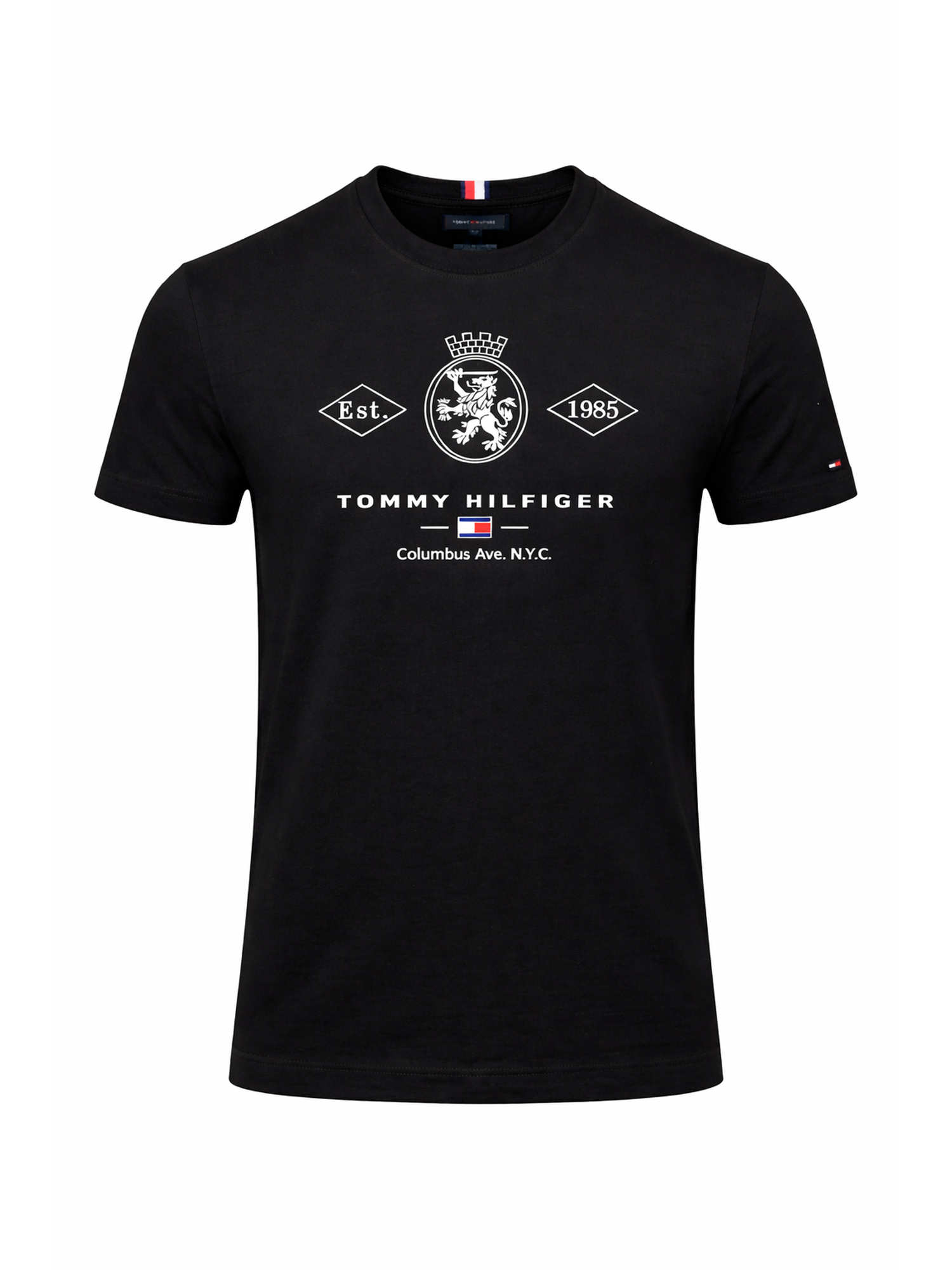 Estampa frontal: Logo e elementos gráficos “Est. 1985” e brasão com referência a Columbus Ave. N.Y.C.