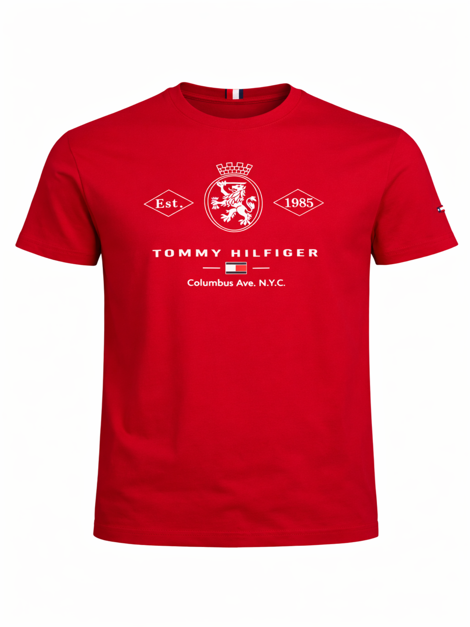 Estampa frontal: Logo e elementos gráficos “Est. 1985” e brasão com referência a Columbus Ave. N.Y.C.